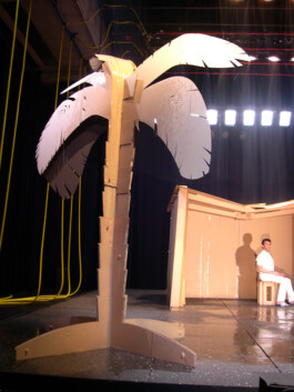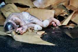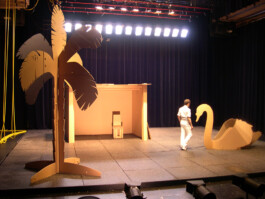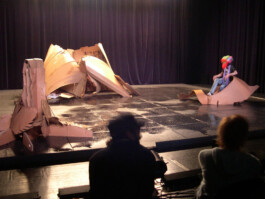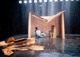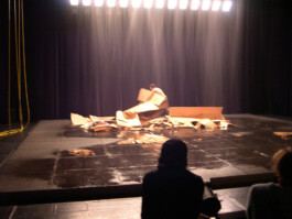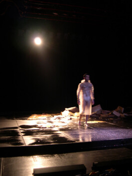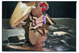 In Blessed a realtime material process is happening on stage with all uncontrollable factors that result from it: A world of cardboard is dissolved live through the contact with water.