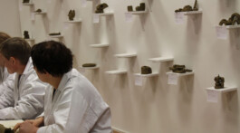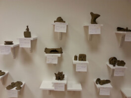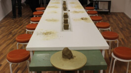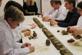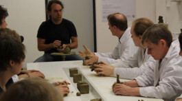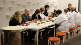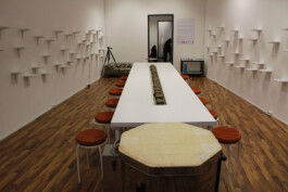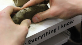 Wissen kneten (Kneading Knowledge) questions the role of haptic experiences in producing and absorbing thoughts. Different experts each hold a lecture for twelve participants at a specially designed table. The lecture should not be fully worked out in advance, but should develop further while speaking. The speaker and the listeners each hold a cube of clay in their hand. After twenty minutes of intense thinking together, very different 3d scribbles were created out of the clay. They were put on small platforms and presented in the room.